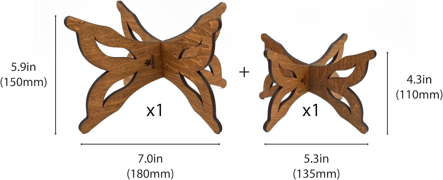Transform your dining presentation with this elegant 2-piece wooden plate serving stand set. Crafted from premium basswood, these butterfly-inspired risers add dimension and style to your table settings. The set includes two interlocking stands: a large stand measuring 7.0 × 5.9 inches and a smaller companion piece at 5.3 × 4.3 inches. Each piece is meticulously laser-cut, hand-assembled, and finished with a rich wood stain that highlights the natural grain patterns. The freestanding design provides stable elevation for your serving plates, making it perfect for entertaining, buffets, or creating dynamic tablescapes. These versatile risers can be used individually or together to create varying heights and visual interest in your food presentation. The beautiful wood-stained finish complements any table setting while maintaining its functional purpose. Please note that serving plates are not included with this set. The precise craftsmanship and attention to detail make this set both a practical serving solution and an attractive addition to your dining accessories.