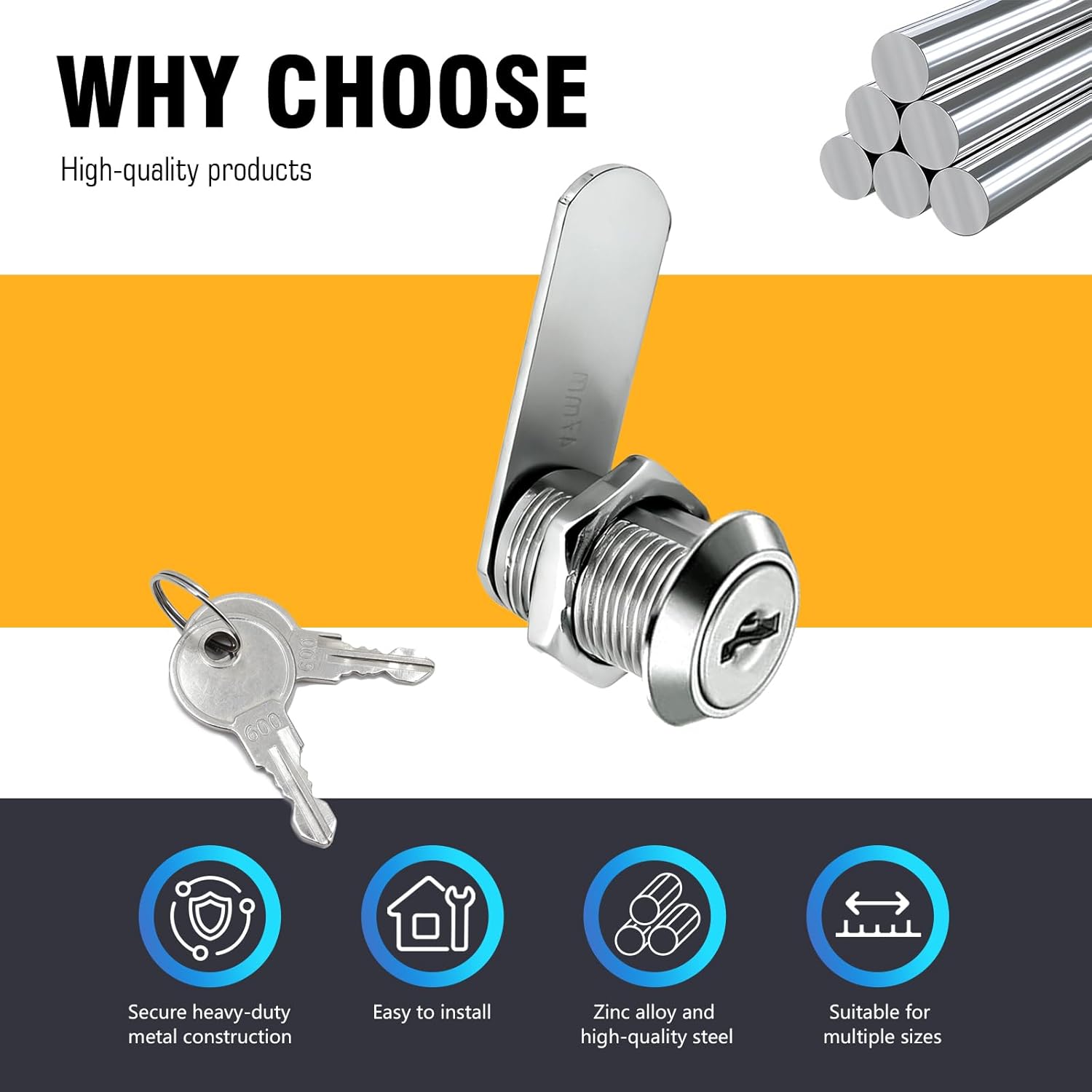MZCR-NNML cabinet locks set include 2Pack 7/8” cabinet lock, 8Pcs keys(keyed alike). Installation is super easy and quick, turn 90 degree clockwise to lock the door, you can remove the key from the locked and unlocked position. 7/8" Cam locks fit on door panels less than 5/8" (18mm) thickness, the mounting hole diameter is 3/4’’(18mm). Please refer to size guidance, check before purchase to make sure dimensions fit your needs.