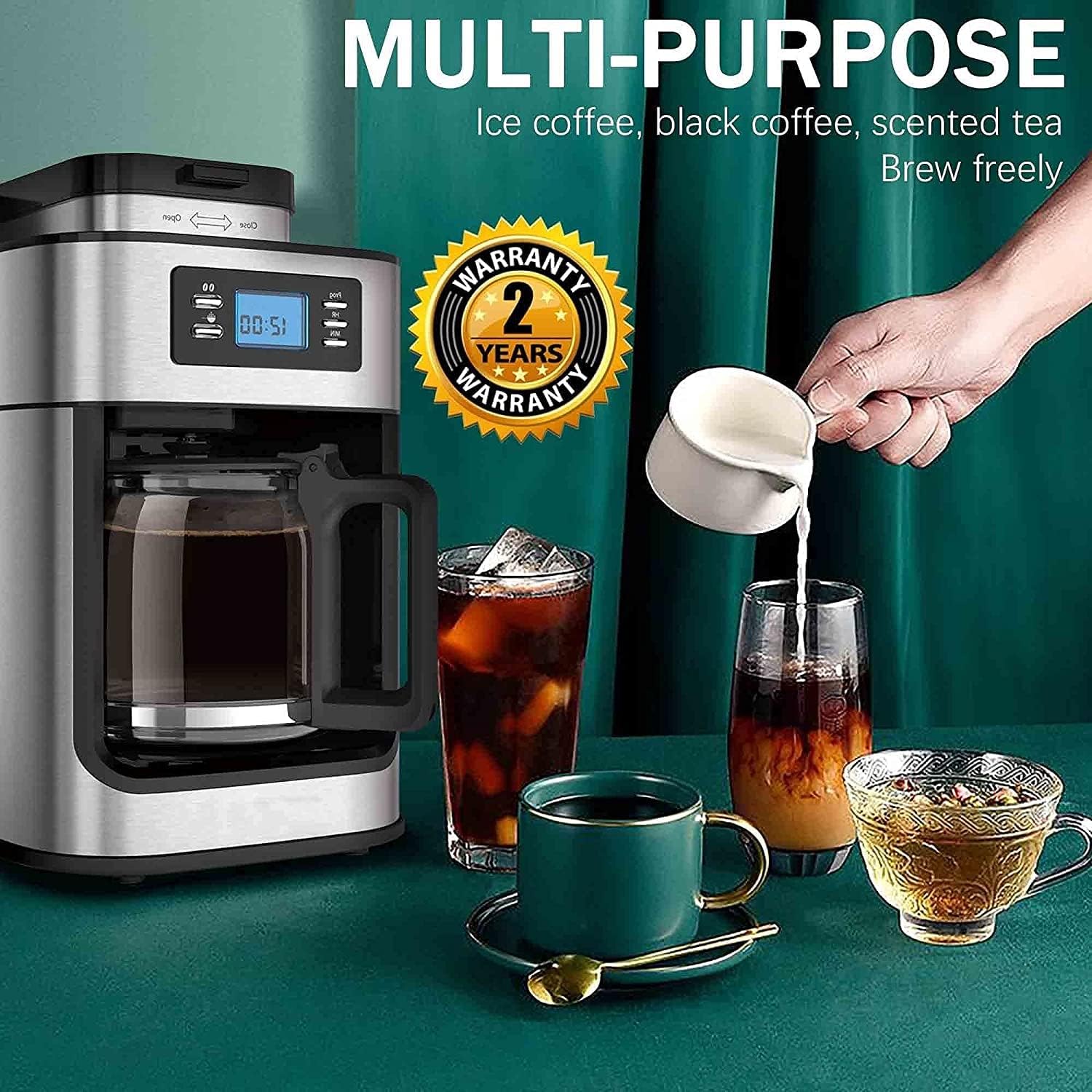 Coffee machine drip coffee machine espresso coffee machine coffee grinder integrated small household coffee pot suitable for home brewing coffeeThe filter coffee machine can provide multiple cups of coffee in a few minutes, enough for your whole family to enjoy fresh filter coffee. You can easily operate the drip coffee machine with a simple on/off button.Removable grinding filter and reservoir:The water reservoir and filter basket are easy to disassemble and clean, which is safer. Cleaning is as simple as making coffee. Detachable components solve the cleaning problem.You can not only brew whole beans or pre-ground coffee powder with this coffee machine, but also brew tea.Control: The operation is simpler and more convenient, bringing you a perfect coffee making experience.