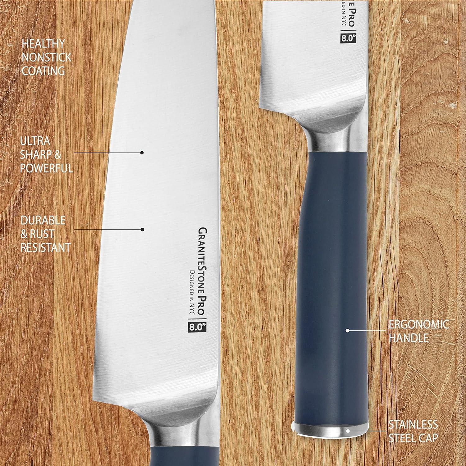 GRANITESTONE PRO 14 PIECE SET- The all in one 14-piece + block set is made with Pro-grade high-Carbon Stainless-steel and feature handles of ABS material which will never splinter or corrode for ultimate comfort and durability perfect for professional or home chefs. ULTRA SHARP- The blades come extremely sharp straight from the box and are stamped from professional quality High-Carbon stainless steel, which is easy to resharpen, and corrosion resistant to power through any task. COMPLETE SET- This set includes 1 Chef Knife, 1 serrated Bread Knife, 1 Slicing Hollow Knife with non-stick notches, 1 Cheese Knife with non-stick notches, 1 Paring Knife, 1 Utility Knife, 6 Steak Knives, 1 Kitchen Shears, and 1 Knife Sharpener. DURABLE & STRONG- Stamped from rust proof and tarnish resistant High-Carbon steel this complete set is strong enough to tackle all your kitchen tasks and will last a lifetime. DISHWASHER SAFE- These knives are dishwasher safe for effortless clean and care. Simply throw them in the dishwasher after use.