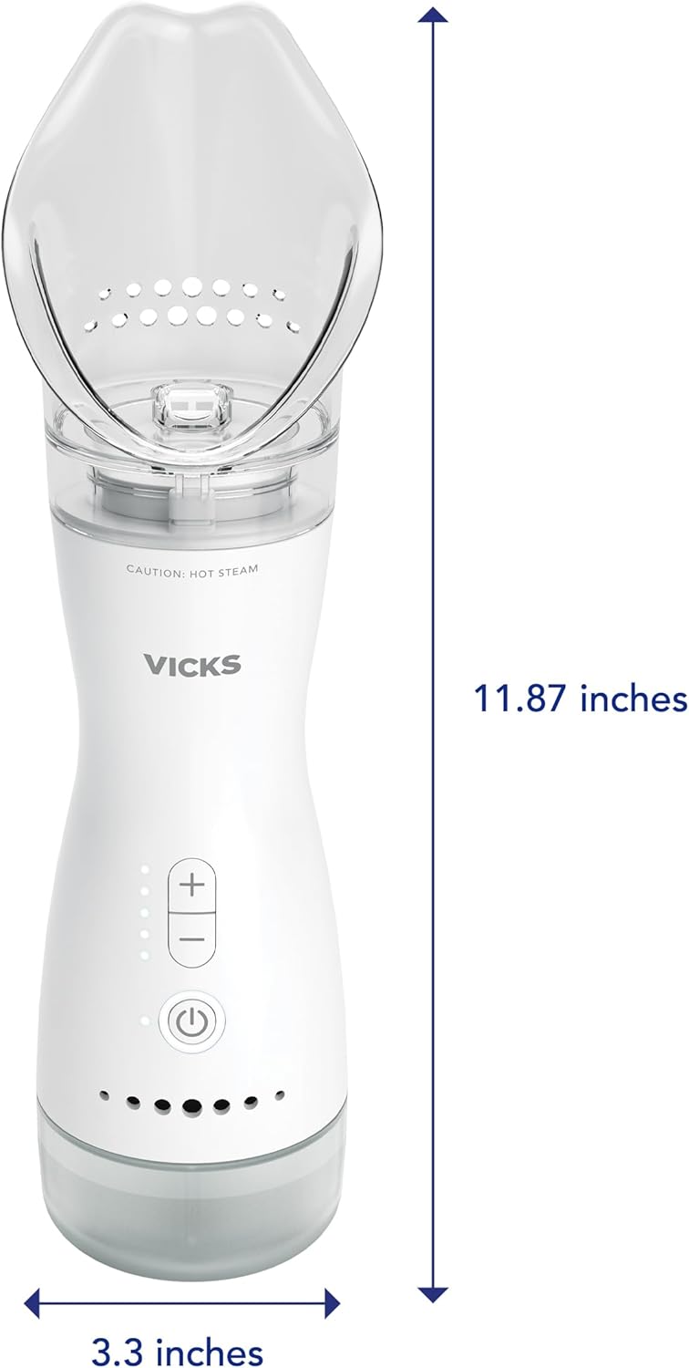 Find fast, soothing allergy and sinus relief wherever you are. The new Vicks Cordless Steam Inhaler delivers warm, hydrating steam to help ease sinus congestion, sinus pressure, cough, and overall respiratory discomfort. This portable steam inhaler for allergies is designed for adults who need reliable, on‑the‑go relief, with no outlet required. Lightweight and easy to use at home, at work, or while traveling, it produces instant, non‑medicated sinus congestion relief to open nasal passages, calm irritated sinuses, and reduce pressure caused by pollen allergies, dry air, sinusitis, and cold symptoms.Use on its own for simple, natural relief, or in combination with your allergy or cold medications to help support breathing comfort when symptoms peak. Five adjustable steam levels let you personalize each session, while the long‑lasting rechargeable battery provides 25–30 minutes of continuous use. Compatible with tap water for everyday convenience, it can also be used with Vicks VapoPads for added aromatic comfort.Whether you need targeted support during allergy season or a drug‑free option to relieve congestion and cough, this cordless warm steam inhaler helps you breathe easier wherever you are.
